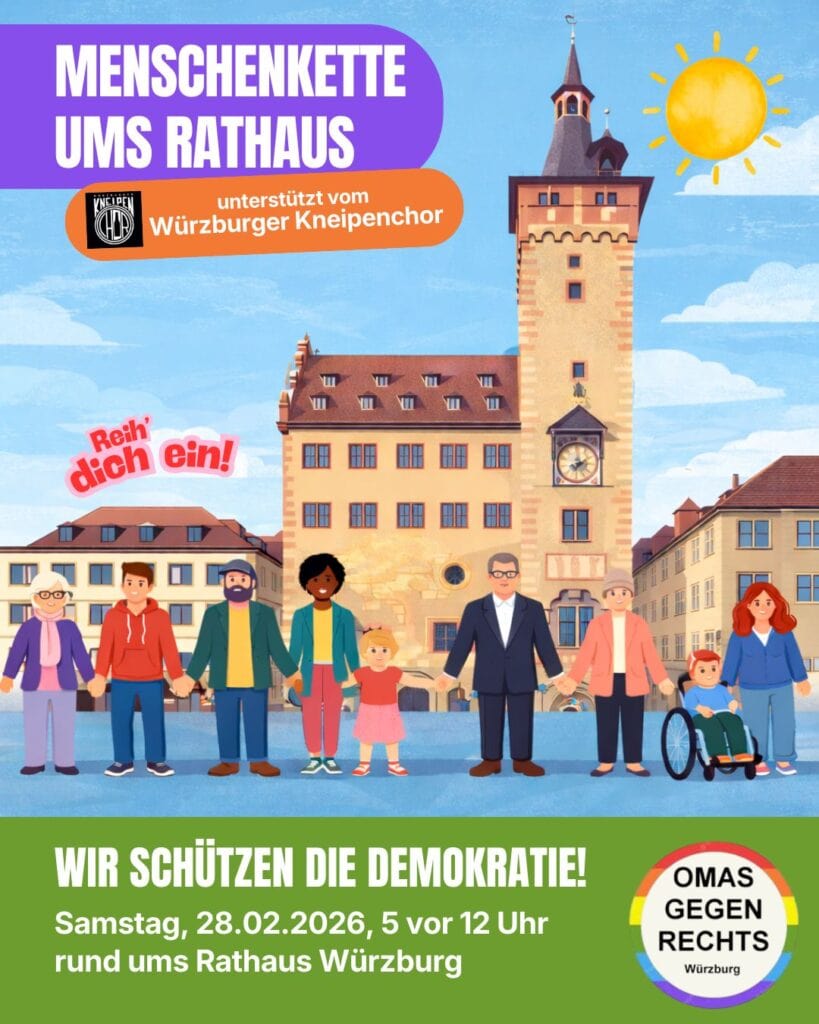 Wir schützen die Demokratie! Hand in Hand zeigen wir: Würzburg steht für Vielfalt, Respekt und Zusammenhalt. Rechtsextremes, rassistisches und menschenverachtendes