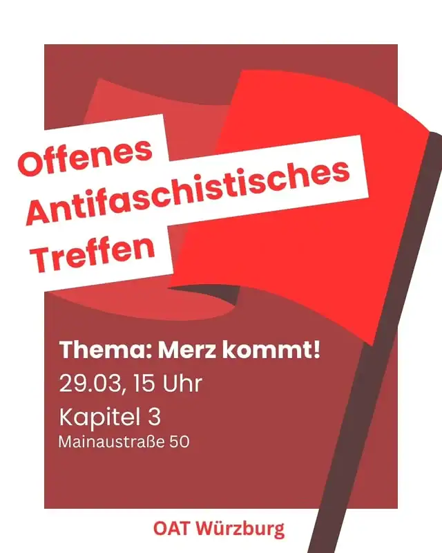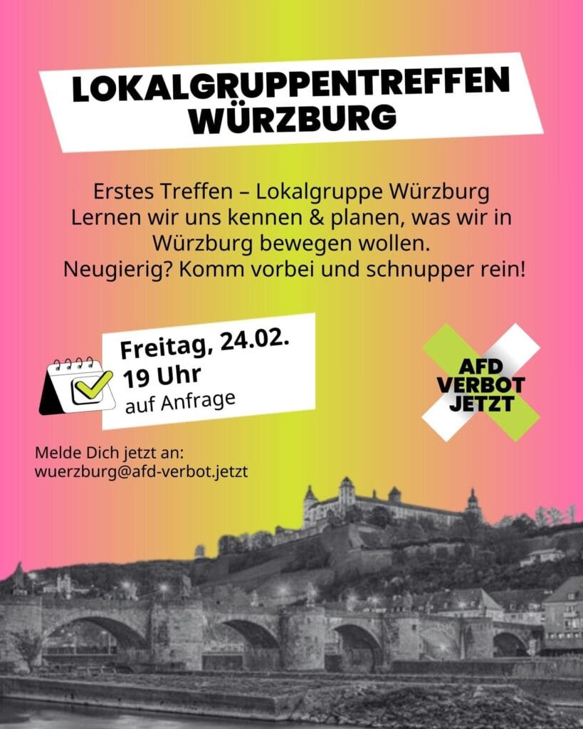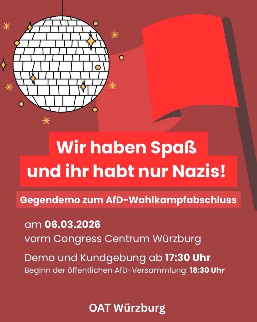 Gegendemo zum AfD-Wahlkampfabschluss Am 06.03.2026 tagt schon wieder der AfD-Kreisverband Würzburg um 18:30 Uhr im CCW, dieses Mal zum Wahlkampfabschluss.